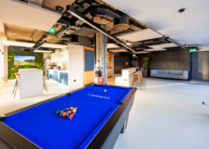 It was a circular approach from day one, with reuse of items they already had at Semple Street, use of things they had access to from other properties, and minimising the carbon use in new materials serving as the three pillars of the design. Doors and glass partitions were reused from Semple Street, and their furniture showcased the circular economy in action. Their new workstations came from a bank in London who were looking to repurpose their desks, and existing furniture items like meeting chairs, a banquette and the pool table were reupholstered by Recycle Scotland.