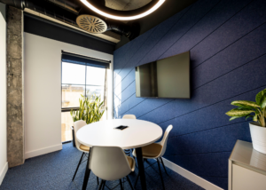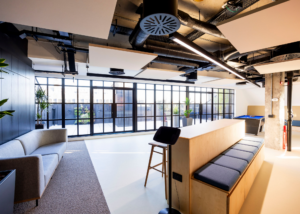 Unique elements of the design include The Haven, a wellness room to serve as a familiar, comforting space away from the desk. This room is designed for multi-purpose use, with soft colours to give it a particular look and feel, a designated fridge for breastfeeding mothers and mats for prayer. The base build was a good canvas on which to work, with black exposed surfaces and raw concrete soffit, and our look and feel naturally aligned with that. The colour scheme is subtle and sophisticated with black as the feature colour that’s brought to life through carpet colours and plywood and the use of blue and yellow ochre throughout.